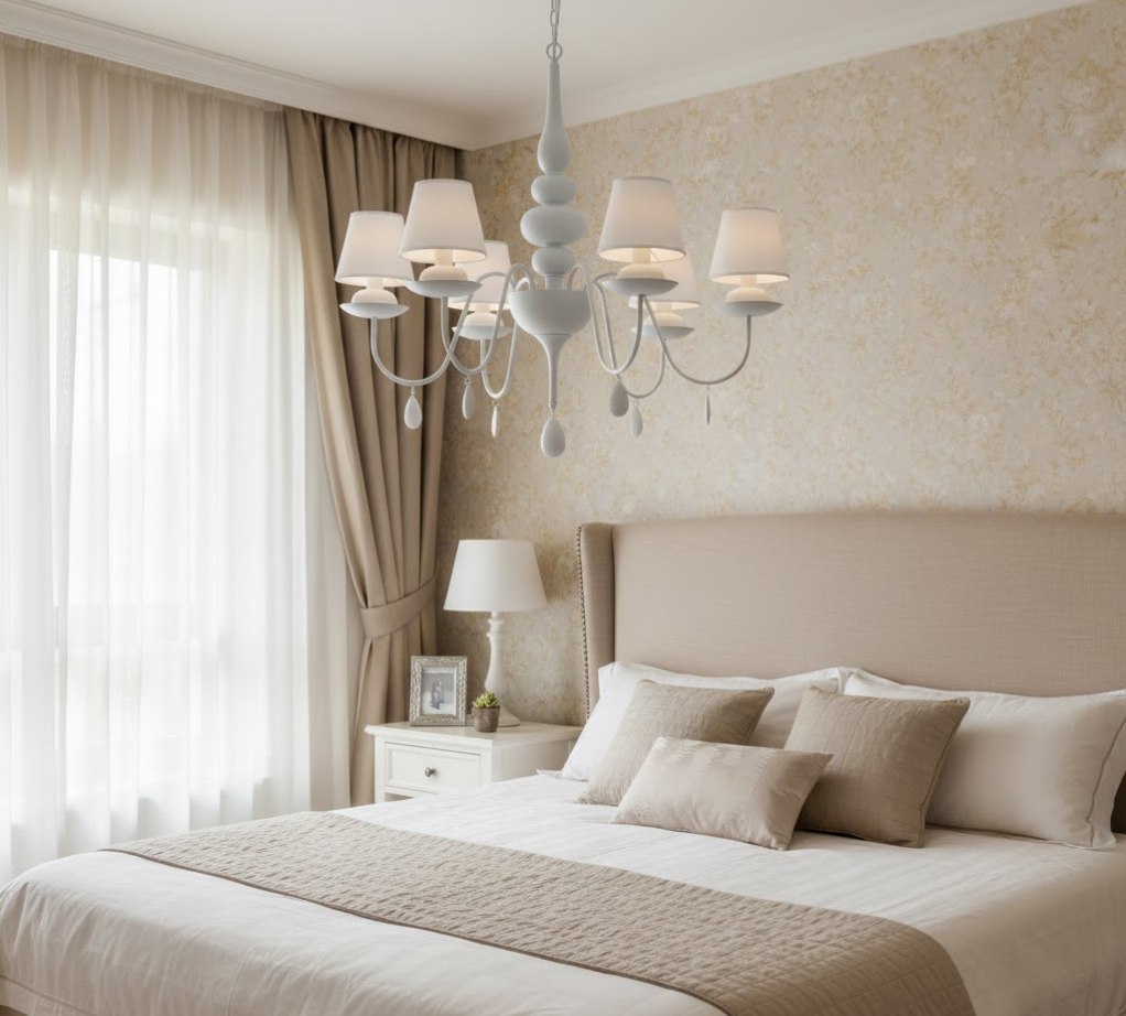 Главное отличие этой модели — наличие классических текстильных абажуров (обычно белого или светлого тона), которые скрывают лампы. Ткань мягко рассеивает свет, создавая уютную, теплую атмосферу без резких теней и бликов. Благодаря диаметру 75 см, люстра выглядит внушительно и гармонично вписывается в просторные спальни, гостиные или столовые в стиле прованс, классика или шебби-шик.