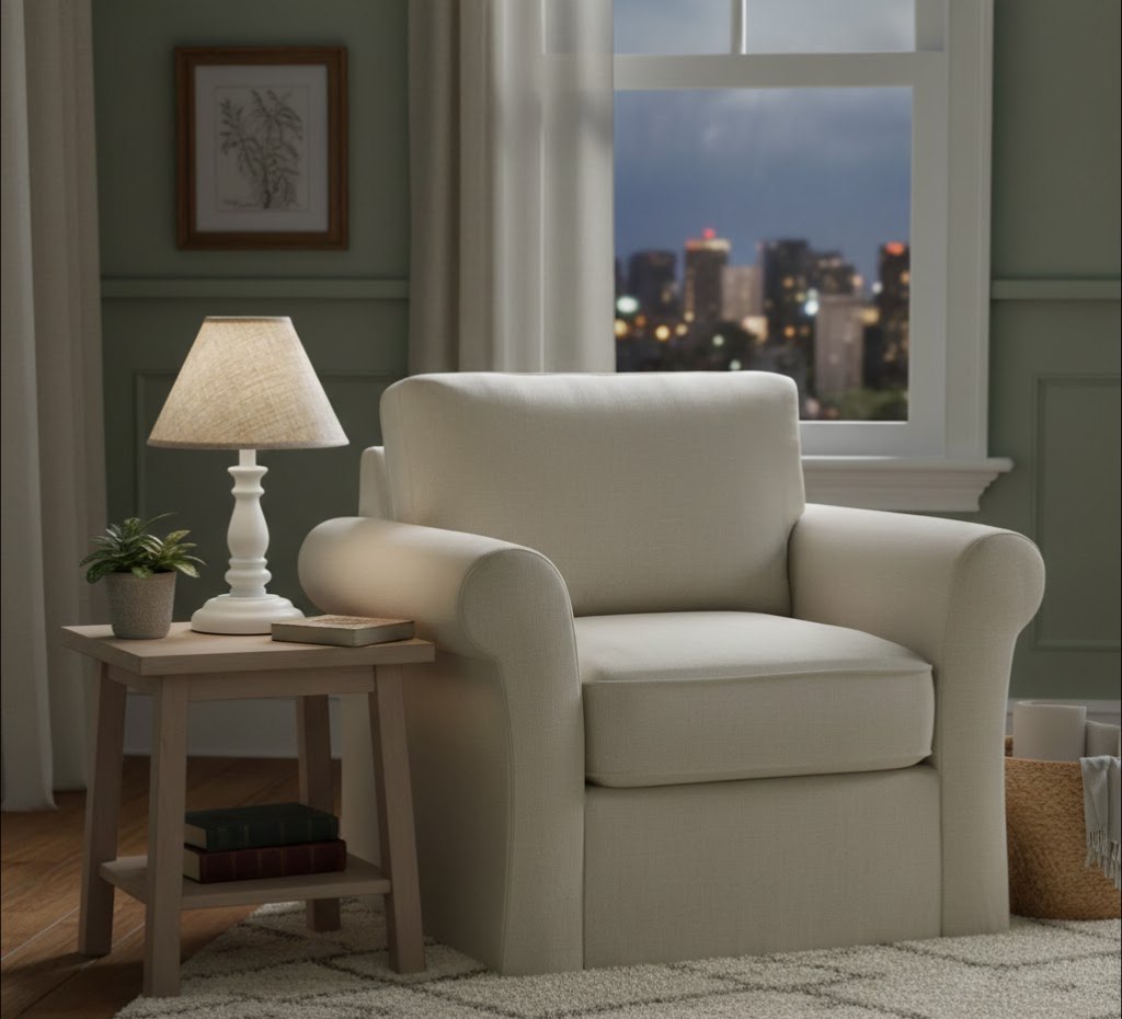 Мягкий свет – плотная ткань абажура деликатно приглушает яркость лампы, создавая расслабляющую обстановку для отдыха.