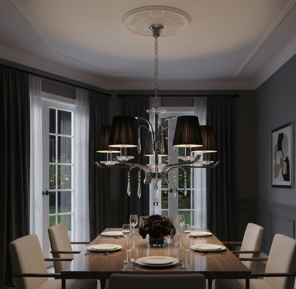 Плавные линии рожков и благородная фактура стекла создают стильный силуэт, который становится главным акцентом в интерьере. Люстра декорирована элементами в тон корпусу, сохраняя монохромную эстетику. Эта модель на 5 ламп идеально подойдет для создания камерной, богемной атмосферы в гостиной, спальне или будуаре, подчеркивая изысканный вкус владельца.