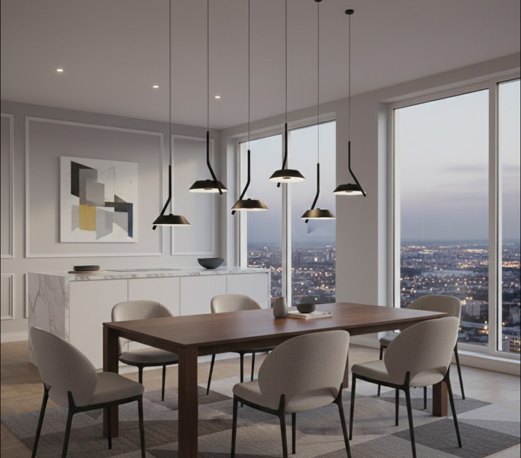 В качестве источника света используется встроенный LED модуль, закрытый матовым белым пластиковым рассеивателем (что создает аккуратный черно-белый контраст). Это обеспечивает мощный, но комфортный направленный поток света вниз. Модель идеально подходит для акцентного зонирования: подсветки барной стойки, кухонного острова, прикроватных тумб или столиков в кафе.