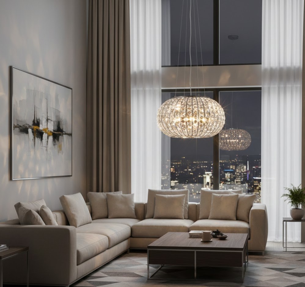Современный гламур – сочетание строгого хрома и сияющего хрусталя выглядит стильно и дорого.