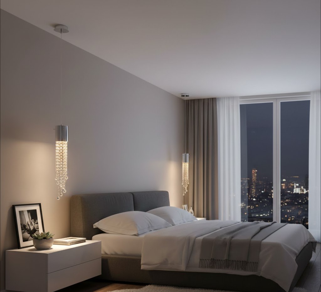 Плафон цилиндрической формы изготовлен из прозрачного термостойкого стекла Pyrex. Внутри стеклянной колбы размещены декоративные подвески из прозрачного хрусталя (октагоны и капли), которые создают эффектную игру света и блеск, напоминая капли дождя. Благодаря компактному диаметру 110 мм, этот светильник идеально подходит для акцентной подсветки: над прикроватной тумбой, барной стойкой или в композиции из нескольких подвесов.