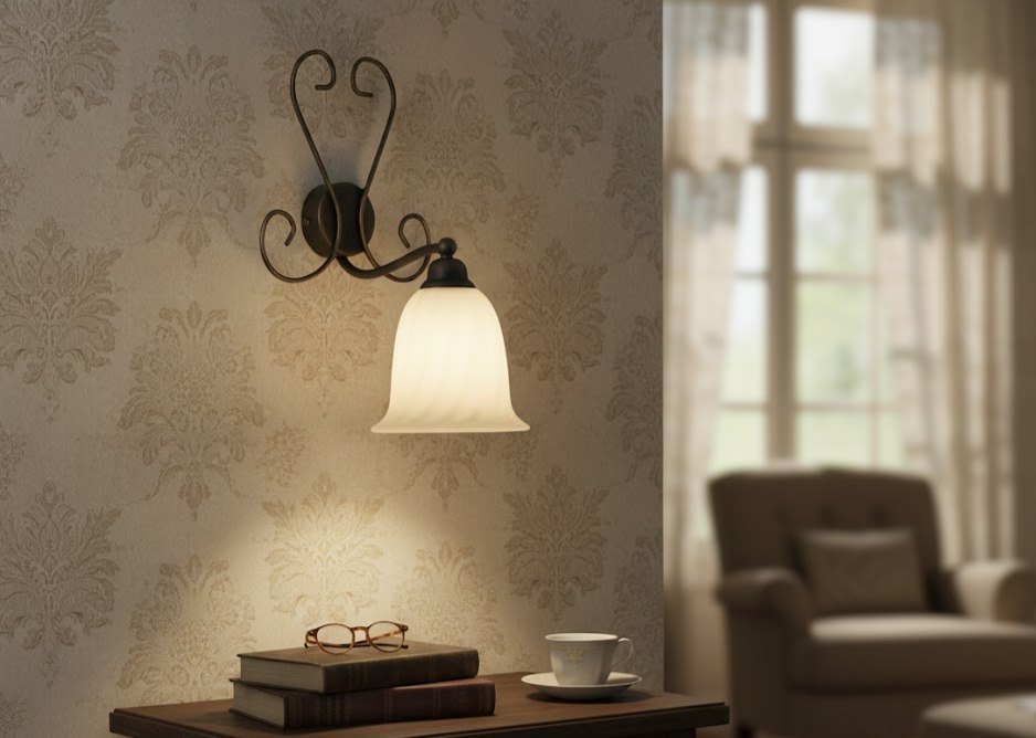 Светильник дополняет плафон из белого стекла (часто с легким мраморным эффектом или матовый), который мягко рассеивает свет, делая его теплым и комфортным. Благодаря такой цветовой гамме, бра идеально вписывается в интерьеры с деревянной мебелью, оформленные в стилях классика, кантри или ретро.