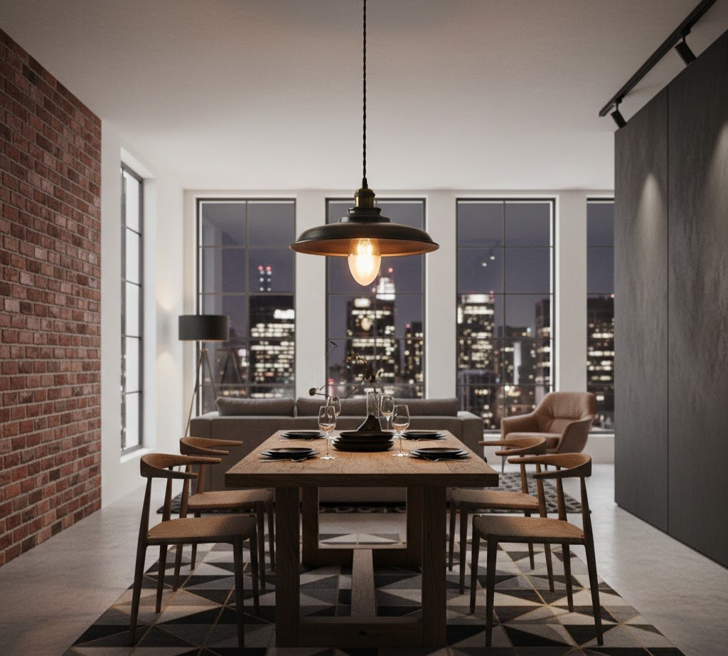Стиль Лофт – классическая форма заводского плафона идеально вписывается в индустриальный дизайн.