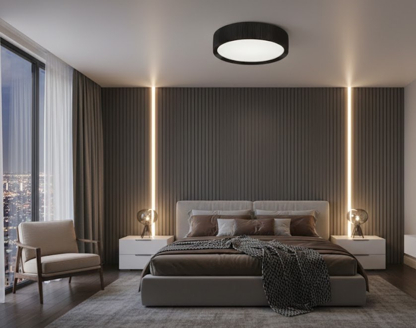 Светильник имеет контрастный черно-белый дизайн: каркас выполнен из металла, а рассеиватель — из стекла. В качестве источника света используется цоколь T5, что подразумевает использование флуоресцентных или LED-трубок. Это обеспечивает высокую энергоэффективность и максимально равномерное распределение света по всей площади плафона, что соответствует принципам минимализма.