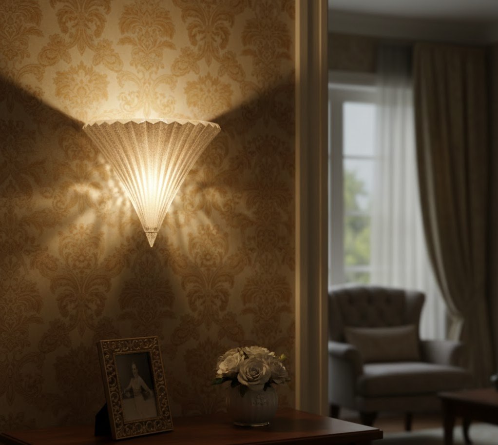 Основной элемент светильника — изогнутый плафон из белого кислотного (матового) стекла. Стеклянная панель мягко скрывает лампу и обеспечивает равномерное, приятное для глаз рассеивание света. Благодаря гладкой поверхности стекла, бра выглядит свежо и аккуратно, идеально вписываясь в интерьеры спален, коридоров или гостиных в стиле модерн или минимализм.
